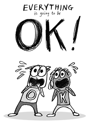The Everything is going to be OK book series follows the disastrous adventures of ten-year-olds Ozzy and Kay as they fight to save their school from the power-hungry schemes of their arch-enemies, Geraldine Tissue and Mervin Snibb.